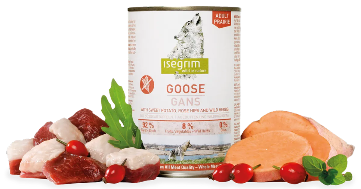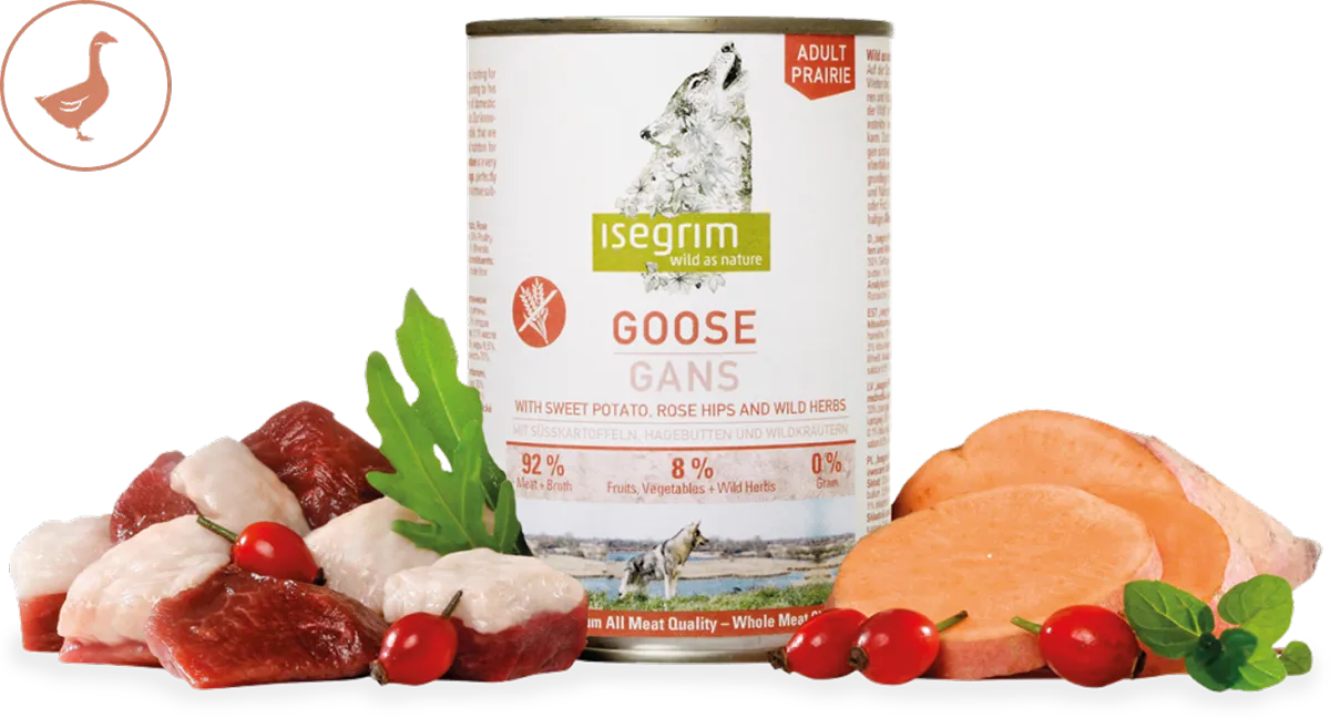 Taka receptura zapewnia Twojemu psu różnorodność i oryginalność składników naturalnych. Odpowiednio opracowana receptura z dodatkiem wysokiej jakości mięsa gęsiego, bogatych w składniki odżywcze batatów, bogatych w witaminę C owoców dzikiej róży i zdrowych dzikich ziół zapewnia Twojemu psu witalność i zadowolenie.