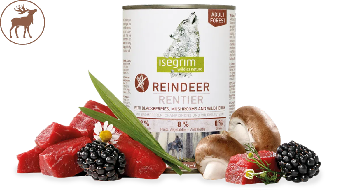 Naturalne mięso z renifera stanowi doskonałe źródło białka w tej pełnowartościowej karmie. Jeżyny, grzyby i dzikie zioła zawierają wszystkie składniki, których pies potrzebuje w ramach zdrowego i pełnowartościowego posiłku.