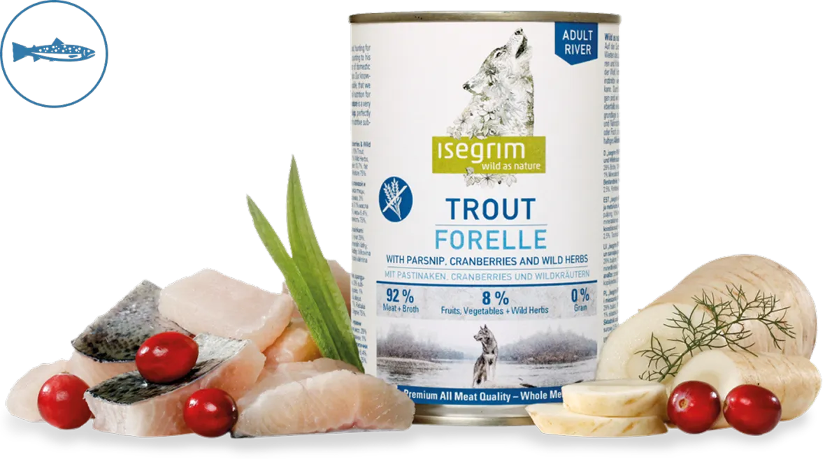 Pyszny pstrąg w połączeniu ze świeżym mięsem drobiowym dostarcza dużo białka i energii. Dodatek pasternaku i żurawiny, która jest bogata w witaminę C, w połączeniu ze specjalną mieszanką dzikich ziół sprawia, że karma isegrim® Trout stanowi smaczny posiłek, który odzwierciedla naturalną i zbilansowaną dietę wilka.