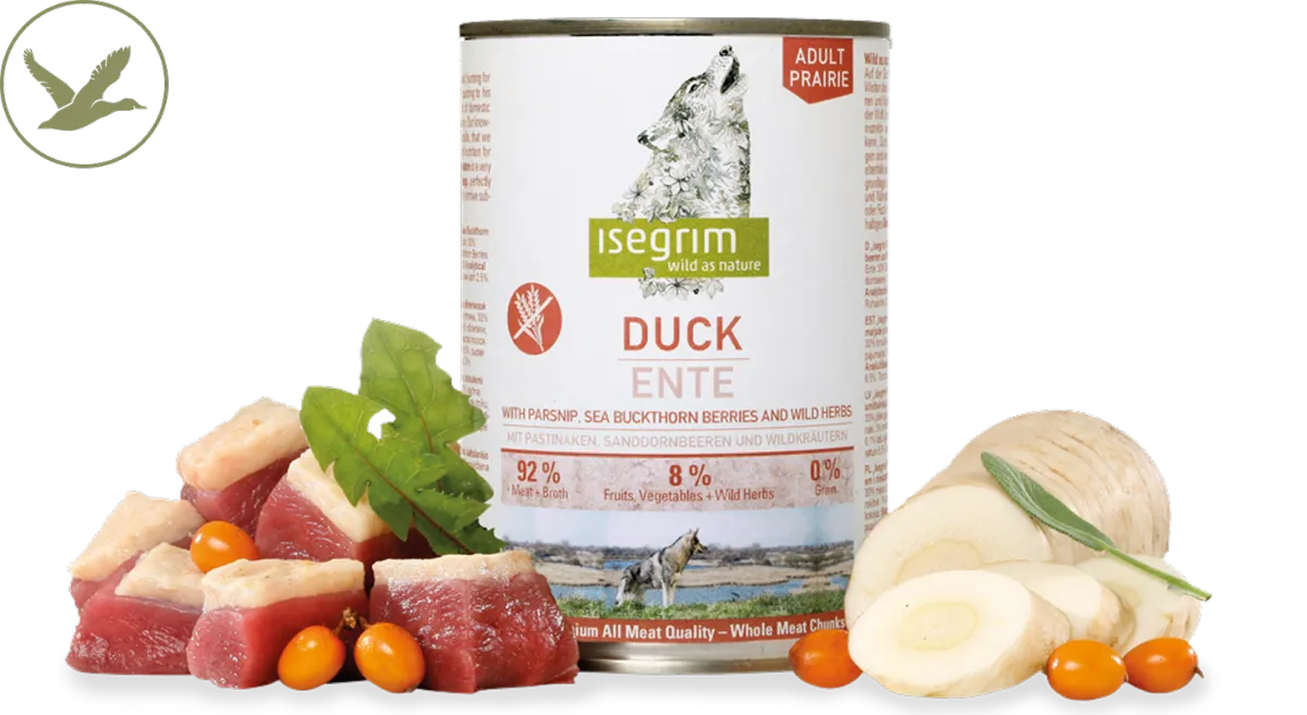 Karma naturalna, odpowiednia dla danego gatunku zwierząt i tak smaczna jak zróżnicowane pożywienie wilków. Mięso z kaczki, owoce rokitnika i dzikie zioła tworzą zbilansowaną żywność, która zapewnia czystą przyjemność z jedzenia.