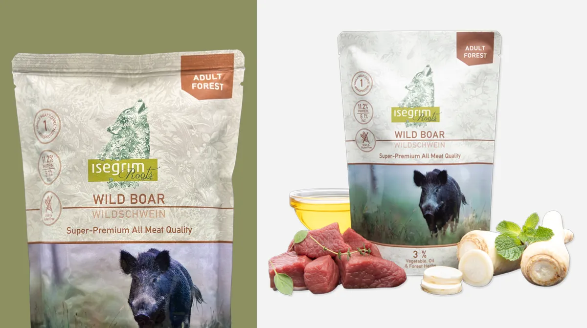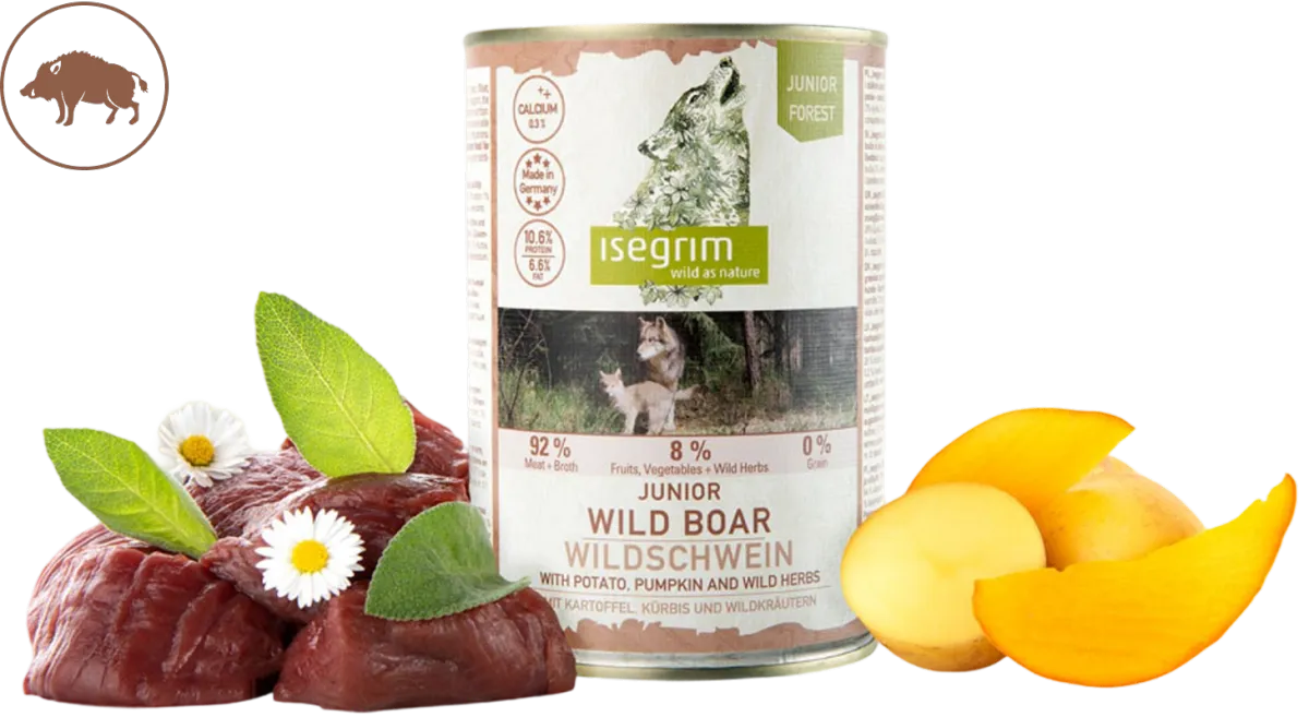 Dziczyzna isegrim® Junior składa się z wysokiej klasy białka zwierzęcego pochodzącego z dwóch źródeł: świeżego mięsa z dzika oraz podrobów, takich jak serce, wątroba i płuca.