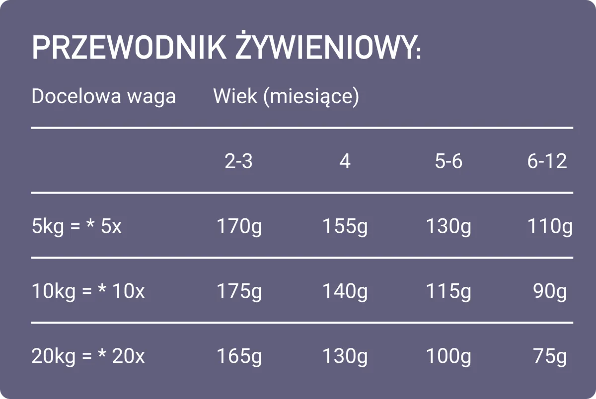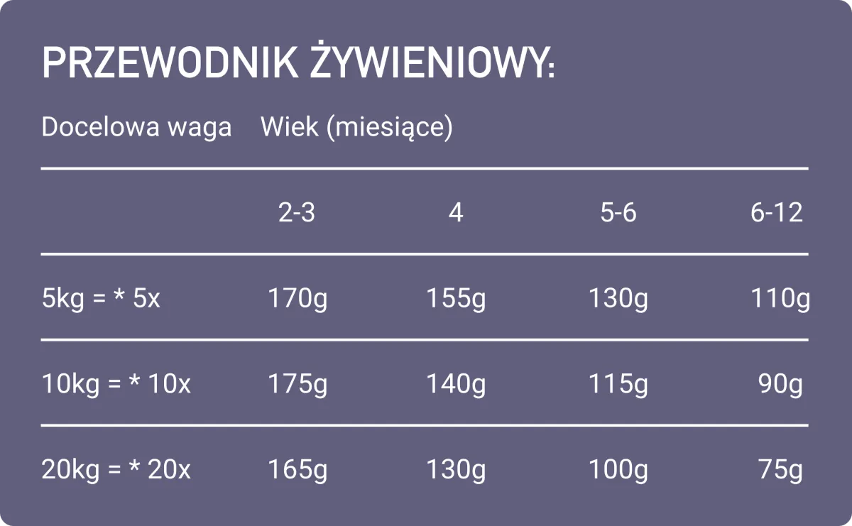 Informacje mają charakter orientacyjny. Podawaj karmę w temperaturze pokojowej i zawsze zapewniaj świeżą wodę do picia.